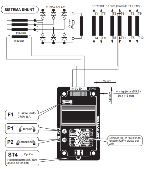 Corriente de excitación nominal de 5 A (hasta 7 A por 10 s) – apto para alternadores con excitación shunt, ideal para cargas transitorias
