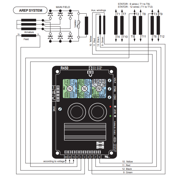 Opciones de configuración mediante interruptores rotativos y potenciómetros para ajustar frecuencia, tipo de excitación, rapidez de respuesta, “droop” y estabilidad .